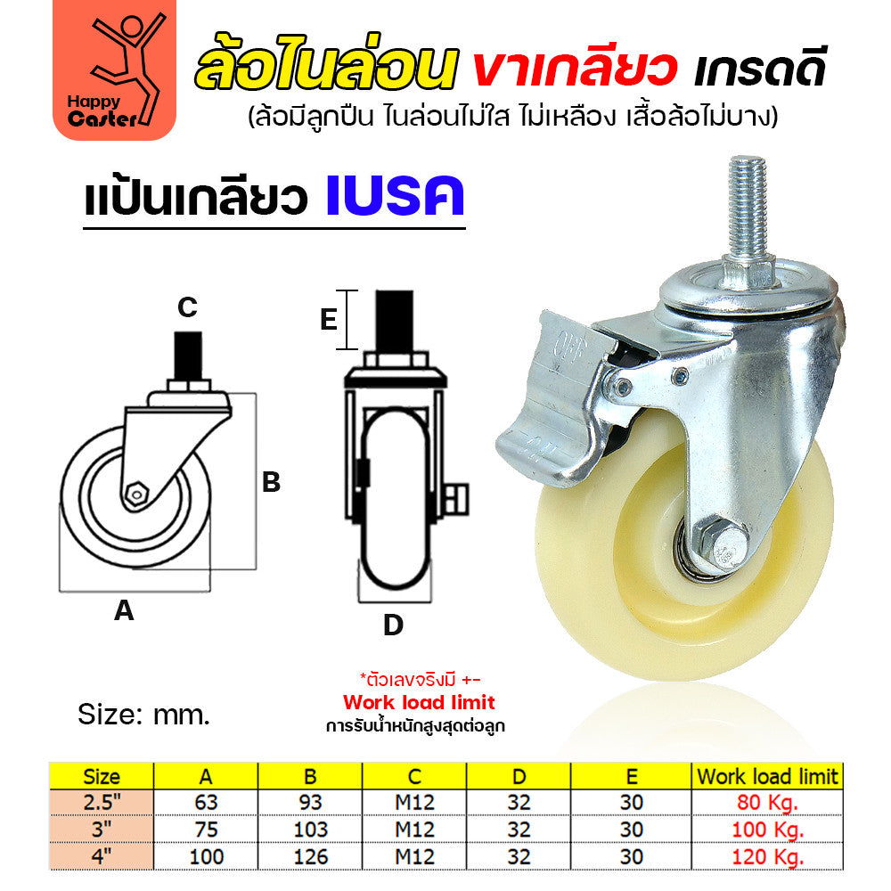 ล้อไนล่อนสีขาว รุ่นCM5 เกลียวเบรค ขนาด 2-1/2 นิ้ว รับน้ำหนักต่อลูกประมาณ 80กิโล