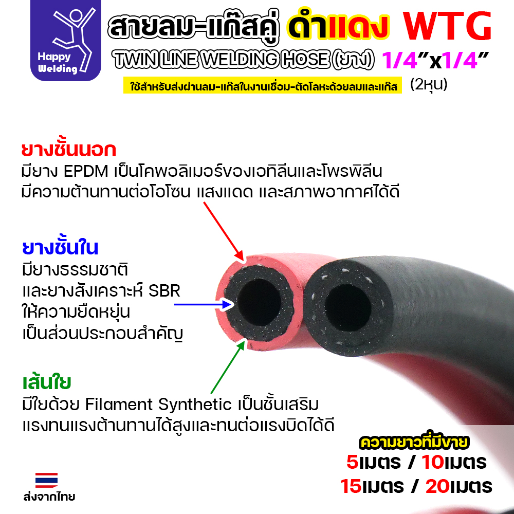 สายลม-แก๊สคู่ยาง WTG สีดำ-แดง ขนาด 1/4"x1/4" (หรือที่รู้จักกันในขนาดเส้นผ่านศูนย์กลางภายใน 6.5 มม. และเส้นผ่านศูนย์กลางภายนอก 13 มม.) เป็นผลิตภัณฑ์ที่ออกแบบมาเพื่อรองรับการใช้งานในงานอุตสาหกรรมทั่วไป ด้วยคุณสมบัติที่โดดเด่นด้านความทนทานและความปลอดภัย