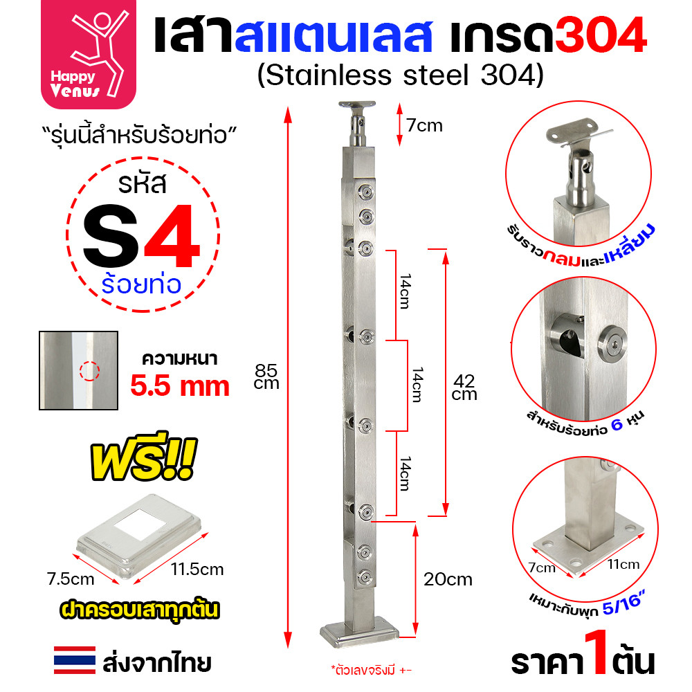เสาสแตนเลส เสาราวกันตก สแตนเลสเกรด304 แถมฝาครอบฟรีทุกต้น (รหัส S4) ราคา 1 ต้น