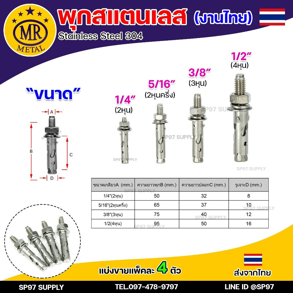 (แบ่งขาย4ตัว) ขนาด M8 หรือ 5/16" (2.5 หุน) MR Metal พุกสแตนเลส พุกไทย เกรด304 ดี ไม่เป็นสนิม