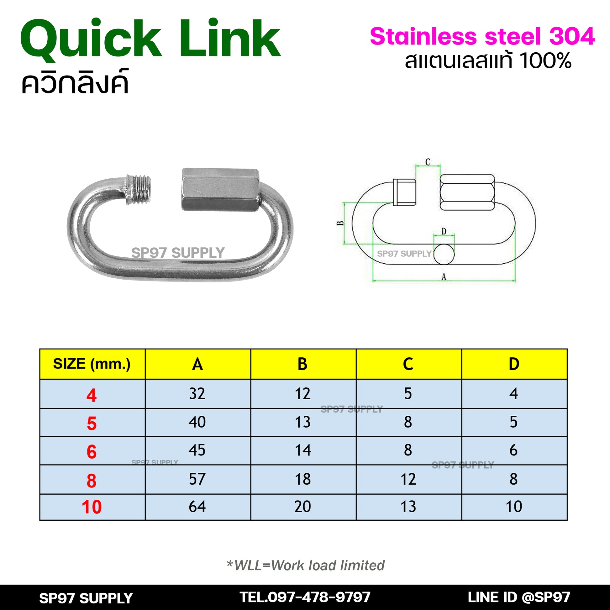 Quick link ข้อต่อควิกลิงค์ สแตนเลสแท้ 100% เกรด 304 ราคาต่อชิ้น ผลิตจากสแตนเลส 304 ไม่เป็นสนิม ใช้สำหรับต่อโซ่ หรือ DIY ตามงานที่ต้องการ มีขนาดให้เลือกตั้งแต่ 4 มิล 5 มิล 6 มิล 8 มิล 10 มิล