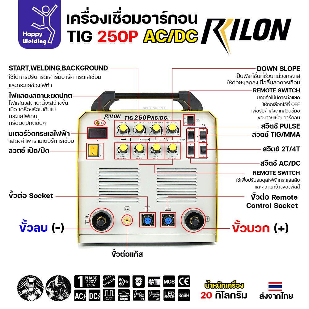Rilon TIG250P AC/DC ตู้เชื่อมอาร์กอน เป็นเครื่องเชื่อม ขนาด250แอมป์ ใช้กระแสไฟฟ้า 220 โวลท์