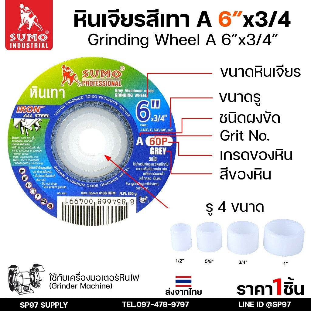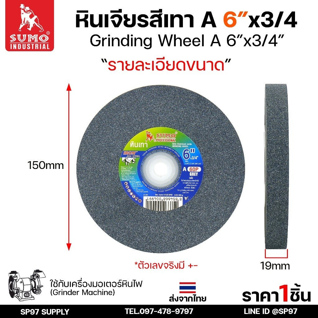 SUMO หินเจียร หินไฟ สีเทา ขนาด 6 นิ้ว x 3/4 นิ้ว 60P สำหรับมอเตอร์หินไฟ/มอเตอร์หินเจียร
